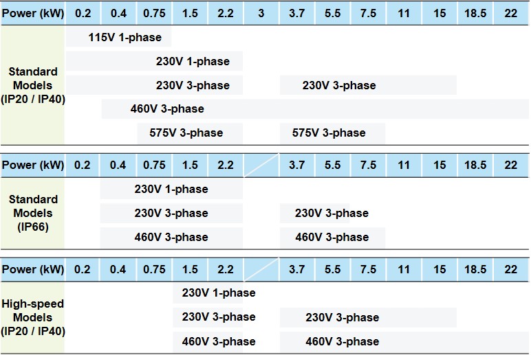 - Built-in RS-485 (Modbus) and various communication card options : CANopen, PROFIBUS DP, DeviceNet, MODBUS TCP, EtherNet/IP, EtherCAT, PROFINET
